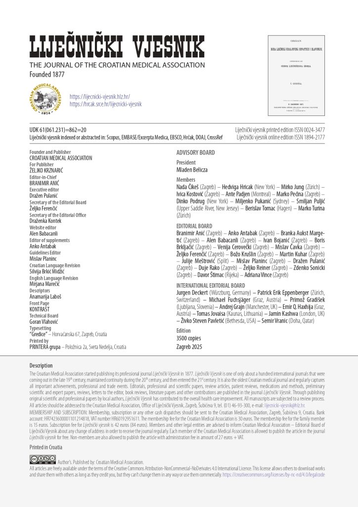 EDITORIAL BOARD Branimir Anić, Clinical Immunology and Rheumatology at the Department of Internal Medicine, School of Medicine University Hospital Centre Zagreb (Zagreb); Dražen Pulanić, Head of Hemostasis, Thrombosis and Benign Hematology, Division of Hematology, University Hospital Centre Zagreb (Zagreb); Anko Antabak, Department of Pediatric Surgery, Clinic of Surgery, Clinical Hospital Center Zagreb (Zagreb); Branka Aukst Margetić, Sestre milosrdnice Clinical Hospital Center, Daily Hospital for Schizophrenia and Related Disorders, School of Medicine University of Zagreb (Zagreb); Alen Babacanli, Emergency Center of the Clinical Hospital Center Sestre milosrdnice Zagreb (Zagreb); Ivan Bojanić, Clinic for Orthopedics Clinical Hospital Center Zagreb, School of Medicine University of Zagreb (Zagreb); Boris Brkljačić, Department of diagnostic and interventional radiology, University Hospital Dubrava, School of Medicine University of Zagreb (Zagreb); Venija Cerovečki, Department of Family Medicine, “Andrija Stampar” School of Public Health, School of Medicine University of Zagreb (Zagreb); Mislav Čavka, Clinical Department of Diagnostic and Interventional Radiology Clinical Hospital Center Zagreb, School of Medicine, University of Zagreb (Zagreb); Željko Ferenčić, Division of Pathology and Cytology at the Children’s Hospital Srebrnjak, Zagreb (Zagreb); Božo Krušlin, Department of pathology and cytology, Sisters of Mercy University Hospital Centre, Zagreb, School of Medicine (Zagreb); Martin Kuhar, Croatian Academy of Sciences and Arts (Zagreb); Julije Meštrović, Clinical Hospital Center Split, School of Medicine University of Split (Split); Mislav Planinc, Clinic for Cardiac Surgery Clinical Hospital Center Zagreb (Zagreb); Dražen Pulanić, Department of Hematology, Department of Internal Medicine, Clinical Hospital Center Zagreb, School of Medicine University of Zagreb (Zagreb); Duje Rako, Polyclinic “Croatia“ (Zagreb); Željko Reiner, Department of Metabolic Diseases Clinic for Internal Medicine Clinical Hospital Center Zagreb, School of Medicine University of Zagreb (Zagreb); Zdenko Sonicki, Department of Medical Statistics, Epidemiology and Medical Informatics, School of Public Health “Andrija Štampar“, School of Medicine University of Zagreb (Zagreb); Davor Štimac, Clinic for Internal Medicine Clinical Hospital Center Rijeka, School of Medicine University of Rijeka (Rijeka); Adriana Vince, Department of Digestive System Infections Clinic for Infectious Diseases Zagreb, School of Medicine University of Zagreb (Zagreb); Miroslav Župčić, Clinical Hospital Center Rijeka, School of Medicine University of Rijeka (Rijeka)
